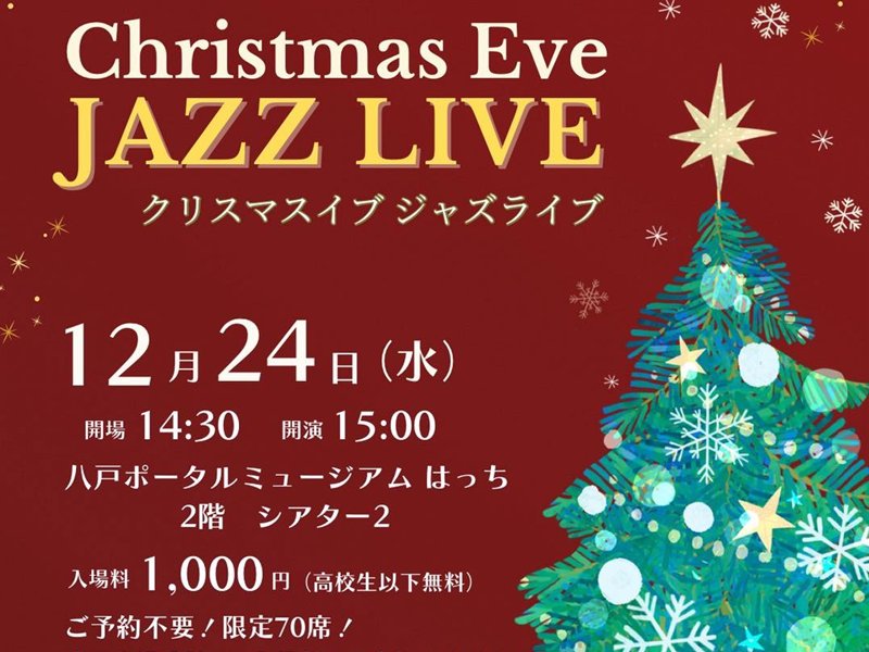 八戸ジャズ楽団 Christmas Eve JAZZ LIVE(クリスマスジャズライブ) イベント 2025.12.05 【 も く じ 】 日時場所入場料お問い合わせ先 日時 12月24日(水) 開場 14:30 開演 15:00 場所 八戸ポータルミュージアム はっち 2階 シアター2 入場料 1000円(高校生以下 無料) ※ご予約不要!限定70席! ※当日会場受付にて入場料をお支払いください お問い合わせ先 八戸ジャズ楽団 hachijazzgakudan8info@gmail.com