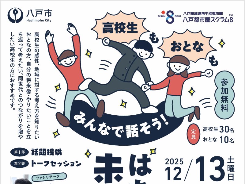 八戸圏域で活躍するゲストスピーカーから、自身の経験や地域への思いに関するお話を聞き、参加者同士がリラックスした雰囲気の中、地域や自分の将来について楽しく真剣に語り合います。