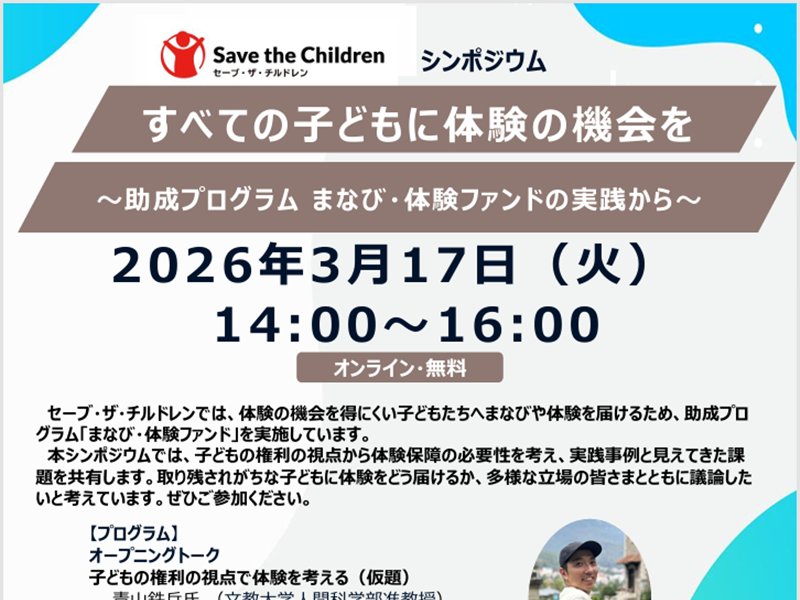 本シンポジウムでは、子どもの権利の視点から体験保障の必要性を考え、実践事例と見えてきた課題を共有します。取り残されがちな子どもに体験をどう届けるか、多様な立場の皆さまとともに議論したいと考えています。ぜひご参加ください。