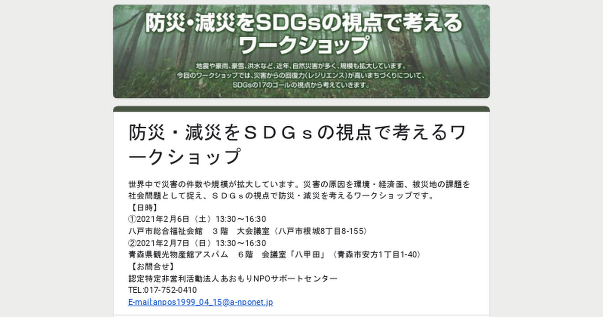 世界中で災害の件数や規模が拡大しています。災害の原因を環境・経済面、被災地の課題を社会問題として捉え、SDGsの視点で防災・減災を考えるワークショップです。【日時】①2021年2月6日(土)13:30〜16:30八戸市総合福祉会館 3階 大…【詳細はコチラ】