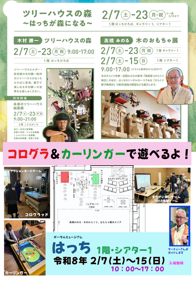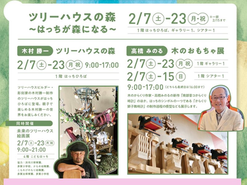 ツリーハウスビルダー・彫刻家の木村勝一制作のツリーハウスがはっちひろばに登場。親子で楽しめる木村勝一の世界をお楽しみください。